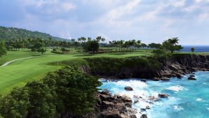 Hålen längs kusten är väldigt vackra men också ett svårt hinder på banan. Försök sikta mitt på green istället för att vara aggressiv på dom hålen för att undvika vatten.